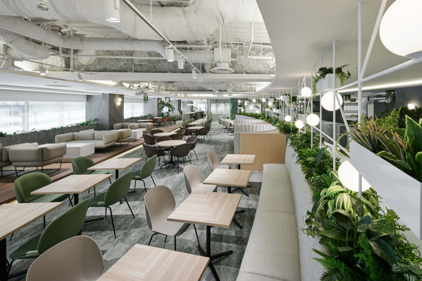 Work in the green. The lounge of Business-Airport Hibiya features arena style layout, it commemorates local theater history and neighbor Hibiya park’s extensive greenery.