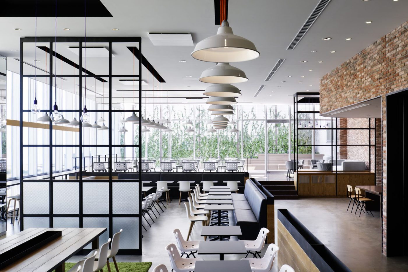 We consistently captured the powerfulness based on industrial material use and modern and sophisticated impressions in all facilities. In the entrance and the elevator hall, dynamic design utilizing the scale feeling unique to the warehouse is made, and in the cafeteria, we design warm designs that many people relax and easy to spend and design distinctive areas. The design of the building facade also adopts impressive stripes while harmonizing with the surrounding environment.